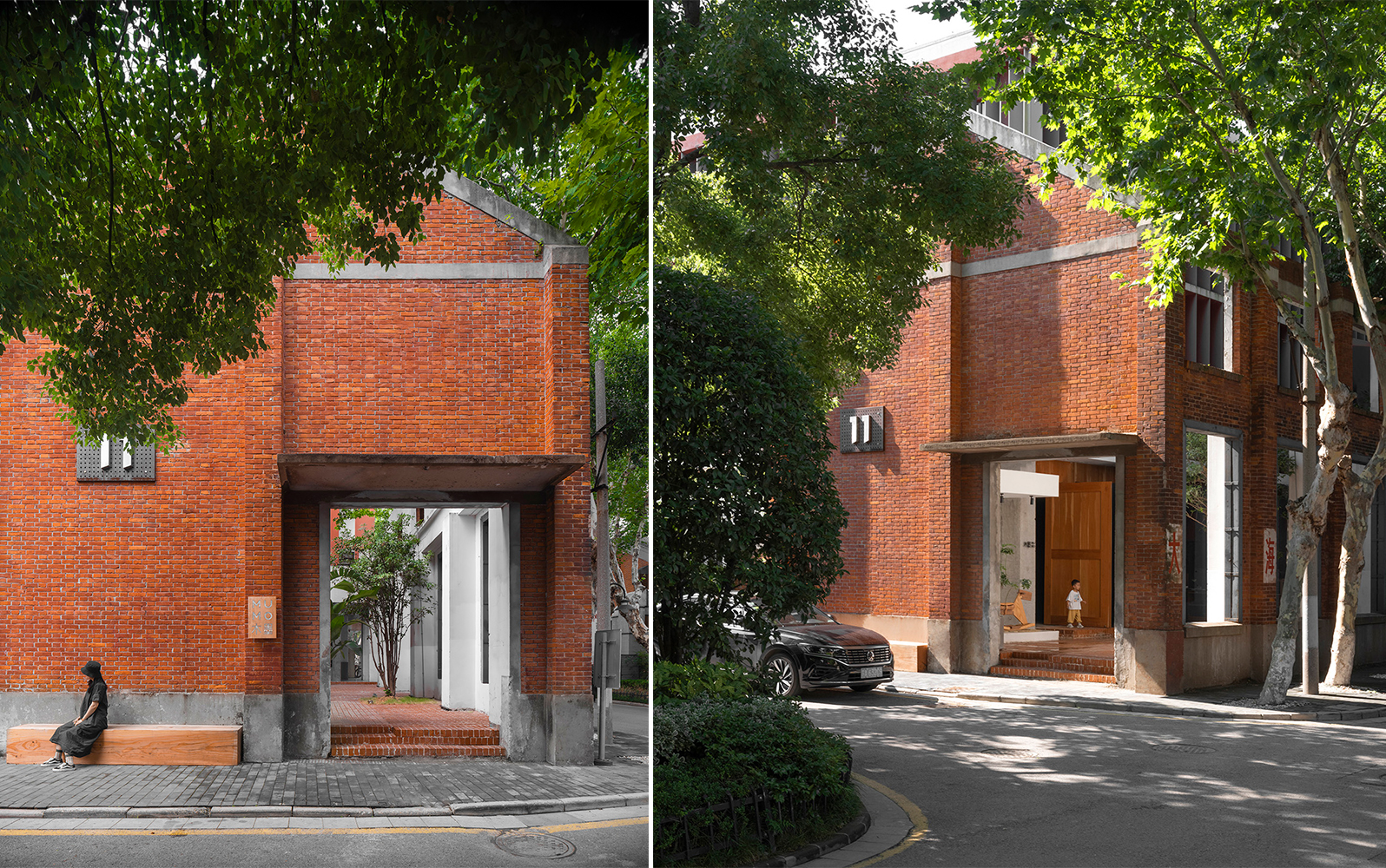 項目的位置正是這棟老樓首層的一側(cè)沿街空間。嚴(yán)格來說,這不是一棟完整的老樓,早期是民國時期江南造幣廠的車間,園區(qū)改造時,新建一棟辦公樓在其內(nèi)部,只剩下幾片高聳的紅色磚墻,延續(xù)著它的前世今生。紅色磚墻上的窗洞著聯(lián)系內(nèi)外兩側(cè)的風(fēng)景,外側(cè)是城市,內(nèi)側(cè)的當(dāng)代建筑脫開磚墻而立,其間的空隙自然形成過渡空間。