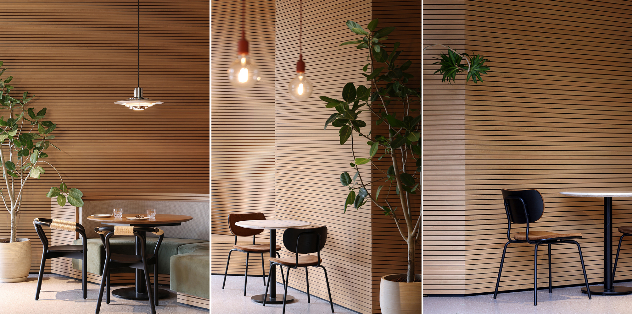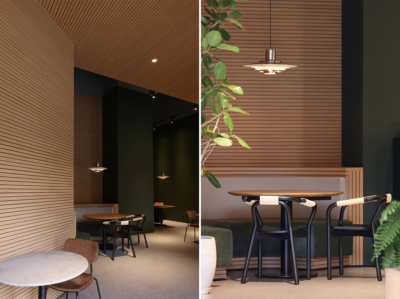 空間材質以溫和的木質搭配綠植為主,讓人與物的關系從城市的工業屬性轉化為自然屬性,為就餐空間創造一個具有場景性的綠洲環境。空間氣質上盡可能避免給人一種“效率化”感受,顏色、材料選擇盡可能地體現“親生物性”,而空間中留有原建筑的跡象,讓二者之間并沒有形成強烈的分隔感,使其相互保持著一種對立與統一。