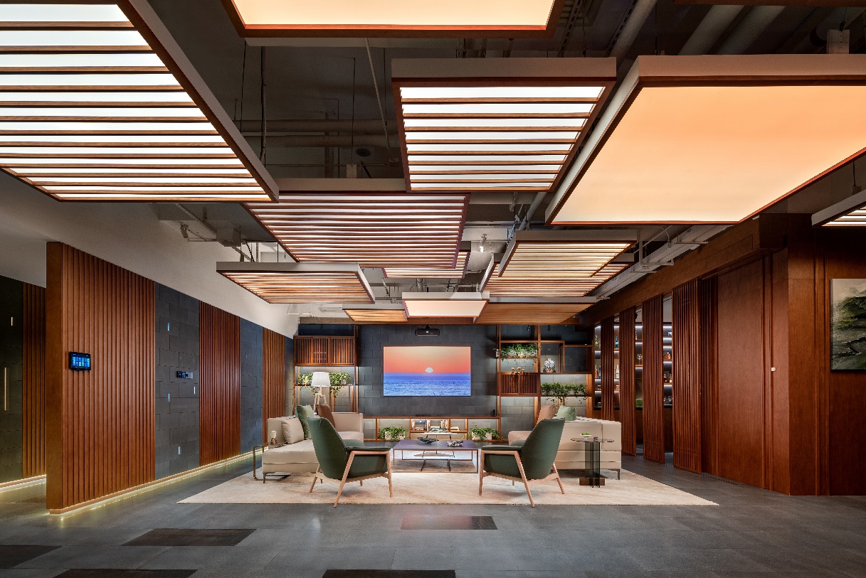 來自中國澳洲設(shè)計(jì)團(tuán)隊(duì)原墨設(shè)計(jì)(YOMO Studio)的設(shè)計(jì)總監(jiān)Merling Xie在綠米科技Aqara VIP展廳設(shè)計(jì)中,也在屋頂做了獨(dú)特的處理,運(yùn)用高低錯(cuò)落、層層疊加的藝術(shù)格柵燈片,在傳統(tǒng)的材料上,通過自身的理解融合新科技在室內(nèi)空間當(dāng)中。室內(nèi)層高有限,頂部遍布著橫豎交織的管道,采用高低錯(cuò)落的格柵燈設(shè)計(jì),巧妙的解決了層高問題,又讓管道在空間中不突兀。以自然環(huán)保、傳統(tǒng)中創(chuàng)新、溫馨舒適為主題,創(chuàng)造了一個(gè)人文、自然、技術(shù)自洽的精神空間。