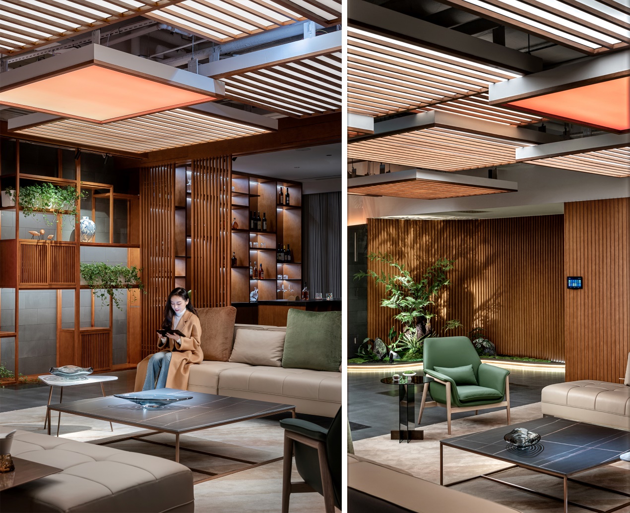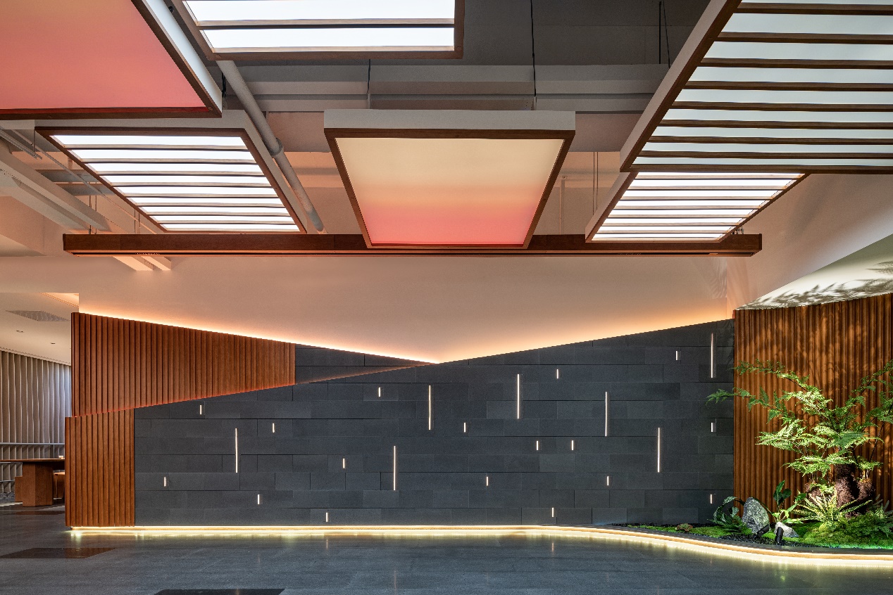 進(jìn)入大廳映入眼簾的是天花節(jié)奏緊密的格柵燈片。燈光分成三組緩緩亮起,溫暖柔和地灑向大廳,令整個(gè)展廳成為人們在嘈雜環(huán)境中的一處閑暇之地。墻面層疊起伏的造型,宛如大自然的山川,層層疊加,結(jié)合柚木色格柵,以及鑲嵌的呼吸燈,遠(yuǎn)山的畫面感油然而生。