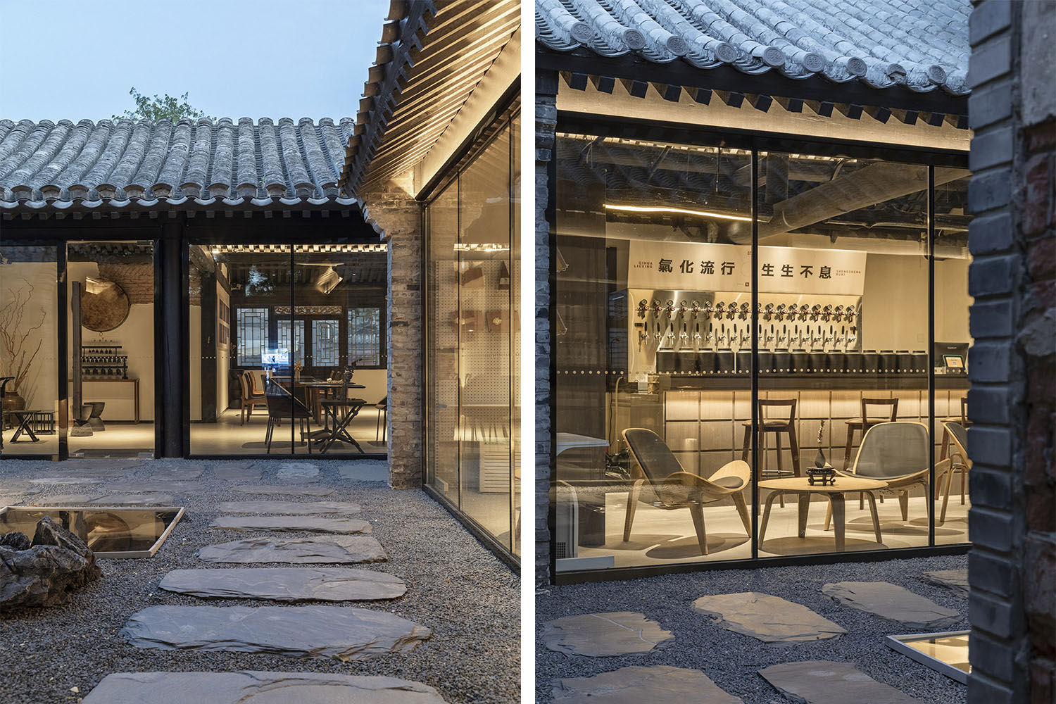 室內、建筑與自然在相互界定中融會貫通,形成一個可以相互滲透的空間結構。我們對原有院落中的墻面、門窗、屋架、鋪地等構造系統進行了整理與修復。設計建設過程中避免使用與地域及歷史時代不相符的現代工業材料和處理方式,在此基礎上,把通透屬性的落地玻璃墻嵌入磚混結構的承重柱里,使得室內外動靜的變化隨時保持著溝通與互動。